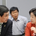 (조세금융신문=전한성 기자) 국회 론스타 긴급토론회 '5조원 세금 걸린 ISD로 다시 보는 론스타 문제 - 대한민국은 론스타에게 언제까지 퍼줄 것인가?'가 22일 오후 서울 여의도 국회 의원회관에서 열린 가운데 새정치민주연합 이종걸(왼쪽) 원내대표와 정의당 심상정 원내대표가 대화 나누고 있다.