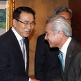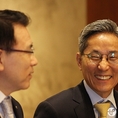 (조세금융신문=전한성 기자) '금융협의회'가 22일 오전 서울 남대문로 한국은행 본관에서 열린 가운데 조용병(왼쪽) 신한은행장이 박종복 스탠다드차타드은행장과 악수 나누고 있다.이날 회의에는 이주열 한국은행 총재를 비롯해 김한조 외환은행장, 김주하 NH농협은행장, 조용병 신한은행장, 윤종규 KB금융지주 회장 겸 KB국민은행장, 박진회 한국씨티은행장, 박종복 한국스탠다드차타드 은행장이 참석했다.