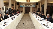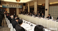 (조세금융신문=전한성 기자) '제2차 금융개혁회의'가 22일 오전 7시 서울 중구 태평로 프레스센터에서 열린 가운데 민상기 금융개혁회의 의장이 임종룡 금융위원장의 모두발언을 듣고 있다.이날 회의에는 민상기 금융개혁회의 의장을 비롯해 임종룡 금융위원장, 진웅섭 금융감독원장 등총 24명이 참석한 가운데 코넥스시장 활성화 방안과 파생상품시장 활성화방안, 비상장주식 장외거래 인프라 강화 방안 등 자본시장 활성화를 위한 안건 등이 논의될 전망이다.