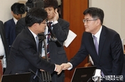 (조세금융신문=전한성 기자) 국회기획재정위원회의 전체회의가 21일 오후 서울 여의도 국회에서 열린 가운데 이돈현(오른쪽) 관세청차장이 정의당 박원석 의원과 악수 나누고 있다.