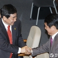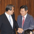 (조세금융신문=전한성 기자) 소득세법 일부개정법률안을 다룰 제333회 국회(임시회) 제1차 본회의가 12일 오후 개의된 가운데 새누리당 김무성(왼쪽) 대표가 홍문종 의원과 악수 나누고 있다.