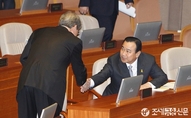(조세금융신문=전한성 기자) 경제 분야 대정부질문이 열린제332회 국회(임시회) 제6차 본회의가 15일 오전 서울 여의도 국회 본회의장에서개의된 가운데 이완구 국무총리가임종룡 금융위원장과악수 나누고 있다.