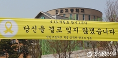 (조세금융신문=전한성 기자) '세월호 참사 1주기'를 하루 앞둔 15일 오후, 경기도 안산시 단원고등학교 정문에 '당신을 결코 잊지 않겠습니다'라고 적힌 현수막이 걸려 있다.