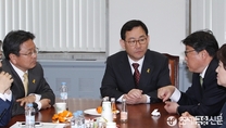 (조세금융신문=전한성 기자) 공무원연금개혁 특별위원회의 전체회의가 열릴 예정이었던 14일 오전, 회의를 앞두고 주호영(가운데) 위원장이 소회의실에 의원들을 소집한 가운데 강기정(왼쪽), 조원진 의원과 대화 나누고 있다.오늘 전체회의에선 공무원 연금개혁을 위한 국민대타협기구 활동경과보고, 연금충당 부채 관련 보고(공무원, 군인 포함), 의사일정 결정의 건 등의 안건을 논의할 예정이었다.