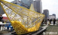 (조세금융신문=전한성 기자) '세월호 참사 1주기'를 앞둔 13일 오후, 서울 광화문광장에 희생자 추모 메시지를 적은 노란 종이배를 접어 넣은 대형 모형배가 설치되어있다.
