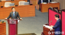 (조세금융신문=전한성 기자) 정치분야 대정부질문이 13일 오전 서울 여의도 국회 본회의장에서 열린 가운데 이완구(왼쪽) 국무총리가 새누리당 김성태 의원의 질의에 답하고 있다.이 총리는 이날 고 성완종 전 경남기업 회장이 남긴 메모에 자신이 이름이 들어 있는 것과 관련해 "왜 이름이 나와 있는지 이해가 되지 않지만, 검찰이 수사를 한다면총리도 대상에 들어가야 한다고 생각한다"라고 밝혔다.