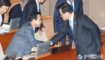 (조세금융신문=전한성 기자) 제332회 국회(임시회) 제5차 본회의가 14일 오전 10시에 개의된 가운데 새누리당 유승민 원내대표가 새정치민주연합 박병석 의원과 대화 나누고 있다.오늘 본회의에선 외교·통일·안보에 관한 대정부 질문과 아베 정부의 독도 영유권 침탈 및 고대사 왜곡에 대한 규탄 결의안이 의결될 예정이다.