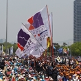 (조세금융신문=전한성 기자) 전국금융산업노동조합(위원장 김문호)이 5월 1일 근로자의 날을 맞아 서울 여의도 문화마당에서 조합원 5만명이 참석하는 '전국금융노동자대회'를 개최한 가운데집회장에 각 노조 깃발이 들어오고 있다.금융노조는 이날 집회에 한국노조조합총연맹 소속 노조로는 이례적으로 집회에 한상균 민주노동조합총연맹 위원장과 김동만 한국노총 위원장을 모두 초청하는 등 정부의 노동시장 구조개혁 추진에 대항해 전면전에 나설 방침이며, 특히 양대노총 위원장이 노동시장 구조개혁에 대한 공동대응 기조를 천명했다.현재 정부는 노동시장 구조개혁에 대한 노사정협상이 결렬되자 ▲ 일반해고 요건 완화 ▲ 취업규칙 불이익변경요건 완화 ▲ 직무성과급제 및 임금피크제 전면 도입 ▲ 기간제 사용기간 연장 및 파견업종 확대 등을 정부 단독으로 추진하겠다는 방침을 고수하고 있고, 반면 금융노조는 정부의 이런 정책이 가장 먼저 공공부문과 시중은행 노동자들에게 강제로 시행될 것이라며 강력 반발하고 있는 상태이다.김문호 금융노조 위원장은 "이명박 정권 시절 정부는 일자리 창출을 명분으로 신입직원들의 초임을 20% 일괄 삭감하는 정책을 공공기관과 시중은행들을 대상으로 시행한 전례