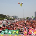 (조세금융신문=전한성 기자) 전국금융산업노동조합(위원장 김문호)이 5월 1일 근로자의 날을 맞아 서울 여의도 문화마당에서 조합원 5만명이 참석하는 '전국금융노동자대회'를 개최한 가운데 조합원들이 구호를 외치고 있다.금융노조는 이날 집회에 한국노조조합총연맹 소속 노조로는 이례적으로 집회에 한상균 민주노동조합총연맹 위원장과 김동만 한국노총 위원장을 모두 초청하는 등 정부의 노동시장 구조개혁 추진에 대항해 전면전에 나설 방침이며, 특히 양대노총 위원장이 노동시장 구조개혁에 대한 공동대응 기조를 천명했다.현재 정부는 노동시장 구조개혁에 대한 노사정협상이 결렬되자 ▲ 일반해고 요건 완화 ▲ 취업규칙 불이익변경요건 완화 ▲ 직무성과급제 및 임금피크제 전면 도입 ▲ 기간제 사용기간 연장 및 파견업종 확대 등을 정부 단독으로 추진하겠다는 방침을 고수하고 있고, 반면 금융노조는 정부의 이런 정책이 가장 먼저 공공부문과 시중은행 노동자들에게 강제로 시행될 것이라며 강력 반발하고 있는 상태이다.김문호 금융노조 위원장은 "이명박 정권 시절 정부는 일자리 창출을 명분으로 신입직원들의 초임을 20% 일괄 삭감하는 정책을 공공기관과 시중은행들을 대상으로 시행한 전례가 있다"며 "청년층
