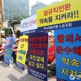 (조세금융신문=전한성 기자) 전국금융산업노동조합(위원장 김문호)이 5월 1일 근로자의 날을 맞아 서울 여의도 문화마당에서 조합원 5만명이 참석하는 '전국금융노동자대회'를 개최한 가운데외환은행 노조원들이 2.17 노사정 합의서 준수를 요구하는 피켓을 들고 있다.금융노조는 이날 집회에 한국노조조합총연맹 소속 노조로는 이례적으로 집회에 한상균 민주노동조합총연맹 위원장과 김동만 한국노총 위원장을 모두 초청하는 등 정부의 노동시장 구조개혁 추진에 대항해 전면전에 나설 방침이며, 특히 양대노총 위원장이 노동시장 구조개혁에 대한 공동대응 기조를 천명했다.현재 정부는 노동시장 구조개혁에 대한 노사정협상이 결렬되자 ▲ 일반해고 요건 완화 ▲ 취업규칙 불이익변경요건 완화 ▲ 직무성과급제 및 임금피크제 전면 도입 ▲ 기간제 사용기간 연장 및 파견업종 확대 등을 정부 단독으로 추진하겠다는 방침을 고수하고 있고, 반면 금융노조는 정부의 이런 정책이 가장 먼저 공공부문과 시중은행 노동자들에게 강제로 시행될 것이라며 강력 반발하고 있는 상태이다.김문호 금융노조 위원장은 "이명박 정권 시절 정부는 일자리 창출을 명분으로 신입직원들의 초임을 20% 일괄 삭감하는 정책을 공공기관