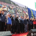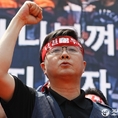 (조세금융신문=전한성 기자) 전국금융산업노동조합이 5월 1일 근로자의 날을 맞아 서울 여의도 문화마당에서 조합원 5만명이 참석하는 '전국금융노동자대회'를 개최한 가운데김문호 위원장이구호를 외치고 있다.금융노조는 이날 집회에 한국노조조합총연맹 소속 노조로는 이례적으로 집회에 한상균 민주노동조합총연맹 위원장과 김동만 한국노총 위원장을 모두 초청하는 등 정부의 노동시장 구조개혁 추진에 대항해 전면전에 나설 방침이며, 특히 양대노총 위원장이 노동시장 구조개혁에 대한 공동대응 기조를 천명했다.현재 정부는 노동시장 구조개혁에 대한 노사정협상이 결렬되자 ▲ 일반해고 요건 완화 ▲ 취업규칙 불이익변경요건 완화 ▲ 직무성과급제 및 임금피크제 전면 도입 ▲ 기간제 사용기간 연장 및 파견업종 확대 등을 정부 단독으로 추진하겠다는 방침을 고수하고 있고, 반면 금융노조는 정부의 이런 정책이 가장 먼저 공공부문과 시중은행 노동자들에게 강제로 시행될 것이라며 강력 반발하고 있는 상태이다.김문호 금융노조 위원장은 "이명박 정권 시절 정부는 일자리 창출을 명분으로 신입직원들의 초임을 20% 일괄 삭감하는 정책을 공공기관과 시중은행들을 대상으로 시행한 전례가 있다"며