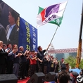(조세금융신문=전한성 기자) 전국금융산업노동조합(위원장 김문호)이 5월 1일 근로자의 날을 맞아 서울 여의도 문화마당에서 조합원 5만명이 참석하는 '전국금융노동자대회'를 개최한 가운데김문호 위원장이 금융노조 깃발을 흔들고 있다.금융노조는 이날 집회에 한국노조조합총연맹 소속 노조로는 이례적으로 집회에 한상균 민주노동조합총연맹 위원장과 김동만 한국노총 위원장을 모두 초청하는 등 정부의 노동시장 구조개혁 추진에 대항해 전면전에 나설 방침이며, 특히 양대노총 위원장이 노동시장 구조개혁에 대한 공동대응 기조를 천명했다.현재 정부는 노동시장 구조개혁에 대한 노사정협상이 결렬되자 ▲ 일반해고 요건 완화 ▲ 취업규칙 불이익변경요건 완화 ▲ 직무성과급제 및 임금피크제 전면 도입 ▲ 기간제 사용기간 연장 및 파견업종 확대 등을 정부 단독으로 추진하겠다는 방침을 고수하고 있고, 반면 금융노조는 정부의 이런 정책이 가장 먼저 공공부문과 시중은행 노동자들에게 강제로 시행될 것이라며 강력 반발하고 있는 상태이다.김문호 금융노조 위원장은 "이명박 정권 시절 정부는 일자리 창출을 명분으로 신입직원들의 초임을 20% 일괄 삭감하는 정책을 공공기관과 시중은행들을 대상으로 시행한