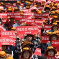 (조세금융신문=전한성 기자) 전국금융산업노동조합(위원장 김문호)이 5월 1일 근로자의 날을 맞아 서울 여의도 문화마당에서 조합원 5만명이 참석하는 '전국금융노동자대회'를 개최한 가운데노조원들이 '근로조건 개악저지'라고 쓰인 피켓을 들고 구호를 외치고 있다.금융노조는 이날 집회에 한국노조조합총연맹 소속 노조로는 이례적으로 집회에 한상균 민주노동조합총연맹 위원장과 김동만 한국노총 위원장을 모두 초청하는 등 정부의 노동시장 구조개혁 추진에 대항해 전면전에 나설 방침이며, 특히 양대노총 위원장이 노동시장 구조개혁에 대한 공동대응 기조를 천명했다.현재 정부는 노동시장 구조개혁에 대한 노사정협상이 결렬되자 ▲ 일반해고 요건 완화 ▲ 취업규칙 불이익변경요건 완화 ▲ 직무성과급제 및 임금피크제 전면 도입 ▲ 기간제 사용기간 연장 및 파견업종 확대 등을 정부 단독으로 추진하겠다는 방침을 고수하고 있고, 반면 금융노조는 정부의 이런 정책이 가장 먼저 공공부문과 시중은행 노동자들에게 강제로 시행될 것이라며 강력 반발하고 있는 상태이다.김문호 금융노조 위원장은 "이명박 정권 시절 정부는 일자리 창출을 명분으로 신입직원들의 초임을 20% 일괄 삭감하는 정책을 공공기관과