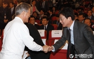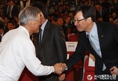 (조세금융신문=전한성 기자) 새정치민주연합과 민주정책연구원이 주최하는 '2015 다함께 정책엑스포'가 6일 오전 서울 여의도 국회 의원회관에서 개막식을 개최한 가운데 새정치민주연합 문재인 대표와 새누리당 유승민 원내대표가 악수를 나누고 있다.정당 사상 최초로 열리는 이번 정책 엑스포는 오는 8일까지 3일간 열리며, 경제성장·복지·일자리 등 경제 담론을 중심으로 30여 차례의 정책토론회와 국회 앞마당에 설치된 106개 부스에서 정책소개와 체험 이벤트 등이 진행된다.