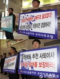 (조세금융신문=전한성 기자) KB금융지주의 '제7기 정기주주총회'가 27일 오전 10시 서울 여의도 KB금융 본점에서 열린 가운데 주총장 입구에 KB금융지주 우리사주조합원들이 나와 직원대표 추천 사외이사를 이사회에 참석 시킬 것을 요구하는 피켓을 들고 있다.