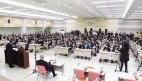 (조세금융신문=전한성 기자) KB금융지주의 '제7기 정기주주총회'가 27일 오전 10시 서울 여의도 KB금융 본점에서 열린 가운데 주총에 참석한 주주들이 윤종규 KB금융지주 회장 겸 KB국민은행장의 인사말을 듣고 있다.이번 주총에서는 지난해 주전산기 교체 과정에서 경영진 내분 사태로 최고경영자들이 바뀌는 등 많은 변화를 겪은 KB금융지주가 '제2의 KB사태'를 방지하기 위해 마련한 지배구조 개선안을 최종 확정할 예정이지만, 회장 연임시 현직 회장에게 먼저 선택권을 주고 평가를 받도록 하는 방식은 새 이사회가 구성된 이후 논의키로 했다.