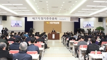 (조세금융신문=전한성 기자) KB금융지주의 '제7기 정기주주총회'가 27일 오전 10시 서울 여의도 KB금융 본점에서 열린 가운데 윤종규 KB금융지주 회장 겸 KB국민은행장이 인사말을 하고 있다.이번 주총에서는 지난해 주전산기 교체 과정에서 경영진 내분 사태로 최고경영자들이 바뀌는 등 많은 변화를 겪은 KB금융지주가 '제2의 KB사태'를 방지하기 위해 마련한 지배구조 개선안을 최종 확정할 예정이지만, 회장 연임시 현직 회장에게 먼저 선택권을 주고 평가를 받도록 하는 방식은 새 이사회가 구성된 이후 논의키로 했다.