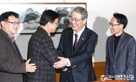 (조세금융신문=전한성 기자) 임종룡 금융위원장이 26일 오후 서울 중구 명동 은행회관에서 금융노조를 만나 금융현안에 대해 논의를 나눈 가운데김문호 전국금융산업노동조합 위원장과 악수를 나누고 있다.임 위원장이 취임 직후 금융노조에 만남을 요청한 것은 이례적인 일로, 금융개혁 및 부정부패 척결, 핀테크 산업 육성 등 최근 금융정책과 관련 협조를 요청하고 금융노조의 의견을 수렴하기 위해 만남을 제안한 것으로 알려졌다.