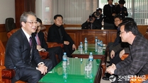 (조세금융신문=전한성 기자) 임종룡 금융위원장이 26일 오후 서울 중구 명동 은행회관에서 금융노조를 만나 금융현안에 대해 논의를 나눈 가운데김문호 전국금융산업노동조합 위원장이 밝은 표정을 짓고 있다.임 위원장이 취임 직후 금융노조에 만남을 요청한 것은 이례적인 일로, 금융개혁 및 부정부패 척결, 핀테크 산업 육성 등 최근 금융정책과 관련 협조를 요청하고 금융노조의 의견을 수렴하기 위해 만남을 제안한 것으로 알려졌다.