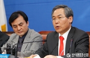 (조세금융신문=전한성 기자) 새정치민주연합 원내대책회의가 24일 오전 9시 서울 여의도 국회에서 열린 가운데 우윤근 원내대표가 모두발언을 하고 있다.우 원내대표는 모두발언에서 해외자원개발 국정조사와 관련 "이명박 전 대통령, 이상득 전 의원, 최경환 경제부총리, 윤상직 산업통상자원부 장관, 박영준 전 차관 등 국민이 다 아는 핵심 증인들이 나와야만 실체적 진실을 밝힐 수 있다"고 증인채택을 요구하고 나섰다.