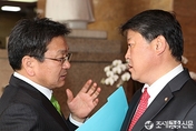 (조세금융신문=전한성 기자) 공무원연금개혁 국민대타협기구 활동 종료 기한이 5일 앞으로 다가온 24일 오전, 서울 여의도 국회 본관 로비에서 국민대타협기구 강기정(왼쪽, 새정치민주연합), 조원진(새누리당) 공동위원장이 긴밀한 대화를 주고 받고 있다.