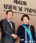 (조세금융신문=전한성 기자) '제42회 상공의 날 기념식'이 18일 오전 서울 강남구 삼성동 코엑스에서 열린 가운데현정은현대그룹 회장이금탑산업훈장상을 받은 후 이완구 국무총리와 기념촬영을 하고 있다.이 자리엔 이 총리를 비롯해 윤상직 산업통상자원부 장관, 박용만 대한상공회의소 회장, 김인호 한국무역협회 회장 등 1000여명이 참석했고, 현정은 현대그룹 회장과 조성제 비아이피㈜ 대표이사가 금탑산업훈장을 수상했다.