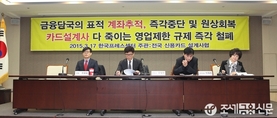 (조세금융신문=전한성 기자) 전국신용카드설계사협회가 17일 오전 10시 서울 중구 태평로 프레스센터에서 기자회견을 열고 ‘금융당국의 무소불위 표적 계좌 추적권 즉각 중단’과 ‘카드 설계사 말살하는 각종 영업규제제한 철폐’를 주장한 가운데 기자회견문을 낭독하고 있다. 왼쪽부터 전광원 회장, 안철현 변호사, 이재복 사무국장, 삼성카드 강영희.