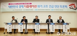 (조세금융신문) 새정치민주연합 정책위원회와 개획재정위원회 위원들이 주최한 '대한민국 경제 디플레이션 위기 고조 긴급 진단 토론회'가 12일 오후 서울 여의도 국회 의원회관에서 열린 가운데 좌장을 맡은 김기흥 국회 입법조사처 경제산업조사실장이 발언을 하고 있다.왼쪽부터 박종규 한국금융연구원 선임연구위원, 안동현 서울대학교 교수, 김기흥 실장, 홍종학 새정치민주연합 의원, 강태수 대외경제정책연구원 선임연구위원.