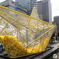 (조세금융신문=전한성 기자) '세월호 참사 1주기'를 앞둔 13일 오후, 서울 광화문광장에 희생자 추모 메시지를 적은 노란 종이배를 접어 넣은 대형 모형배가 설치되어있다.