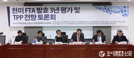 (조세금융신문) TPP-FTA 대응 범국민대책위원회(구 한미 FTA 저지 범국민운동본부)가 주최한 '한미 FTA 발효 3년 평가 및 TPP 전망 토론회'가 9일 오후 서울 여의도 국회 의원회관에서 열린 가운데 토론자들이 자료를 살피고 있다.왼쪽부터 장경호(농민연구소 '녀름' 부소장), 남희섭(오픈넷 이사), 정태인(칼폴라니경제연구소 소장), 송기호(민변 국제통상위원회), 우석균(보건의료단체연합 정책위원장), 박하순(민주노총 정책연구원).