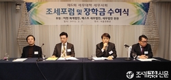 (조세금융신문=전한성 기자) 세무대학 세무사회가 5일 오후 서울 삼성동컨벤션센터에서 '제6회 조세포럼 및 장학금수여식'을 개최한 가운데 이동기 연수이사가 발언을 하고 있다.왼쪽부터 김갑순 한국납세자연합회장, 배형남 동국대겸임교수(세무법인율현대표), 이동기 연수이사, 안호영 서울지방회장.