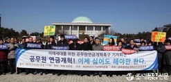 (조세금융신문=전한성 기자) 세금바로쓰기 납세자운동본부가 4일 오전 11시 서울 여의도 국회의사당 앞에서 '공무원연금개혁 촉구 기자회견'을 연 가운데 기자회견에 참석한 회원들이 공무원연금개혁 찬성을 요구하는 피켓을 들고 있다.