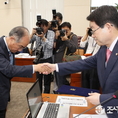 (조세금융신문=전한성 기자) 한국수출입은행·한국조폐공사에 대한 국회 기획재정위원회의 국정감사가 1일 서울 여의도 국회에서 열린 가운데 이덕훈(왼쪽) 수출입은행장이 정희수 위원장과 악수 나누고 있다.