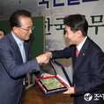(조세금융신문=전한성 기자) '(주)한길TIS 임시주주총회'가 1일 오후 서울 서초구 명달로 한국세무사회관에서 열린 가운데 백운찬(왼쪽) 한국세무사회장이 정구정 이사회의장에게 공로패를 전달하고 있다.