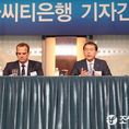 (조세금융신문=전한성 기자) '한국시티은행 기자간담회'가 19일 오전 서울 중구 소공로 웨스틴 조선호텔에서 열린 가운데 박진회(오른쪽, 왼쪽엔 브렌단 카니 소비자금융그룹 수석 부행장) 행장이 기자들의 질문에 답변하고 있다.