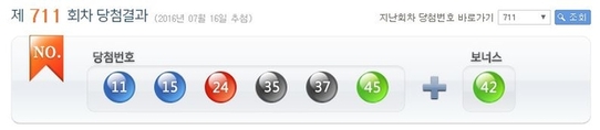 (조세금융신문=하지연 기자) 제711회 나눔로또복권 추첨 결과가 나왔다. 나눔로또는 11일 제711회 로또복권 추첨에서 ‘11, 15, 24, 35, 37, 45’가 1등 당첨번호로 뽑혔다고 밝혔다. 2등인 보너스번호는 42이다. 나눔로또 제706회 당첨번호 6개를 모두 맞힌 1등 당첨자는 총 7명으로 각각 22억7,741만3,358원씩 받게 됐다. 당첨번호 5개와 보너스 번호가 일치한 2등은 44명으로 6,038만원씩 받게 된다. 당첨번호 5개를 맞힌 3등은 1,865명으로 각각 142만원씩 받는다. 당첨번호 4개를 맞힌 4등(고정 당첨금 5만원)은 8만9,898명, 당첨번호 3개가 일치한 5등(고정 당첨금 5,000원)은 146만5,123명이다. 제711회 로또 1등이 당첨된 복권명당은 ▲서울 도봉구 방학2동 복권방담배 ▲서울 성동구 하왕십리동 운수대통가판점 ▲서울 성북구 장위동 CU ▲대전 유성구 봉산동 송강로또 ▲경기 남양주시 도농동 스카이25 ▲경기 하남시 신장2동 건강마트 ▲세종 금남면 용포리 세종로또복권방 등 총 7곳이다. 1등 당첨자 중 3명이 자동을, 4명이 수동을 선택한 것으로 나타났다. 나눔로또 당첨금은 지급개시일로부터 1년 이내