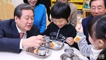 (조세금융신문) 김무성 새누리당 대표가 16일 오후 서울 강서구 육아종합지원센터내 드림 어린이집에서 열린 새누리당 안심보육 현장 정책 간담회를 마친 후 어린이들과 간식을 먹으며 이야기를 나누고 있다. <사진=공동취재단>