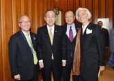 현오석 부총리 겸 기획재정부 장관이 G20재무장관.중앙은행총재회의 참석차 미국 워싱턴을 방문중인 참석자들과 기념촬영. (좌로부터) 현오석 부총리, 반기문 UN사무총장, 김용 WB총재, 크리스틴 라가르드 IMF총재. 사진=기획재정부 제공