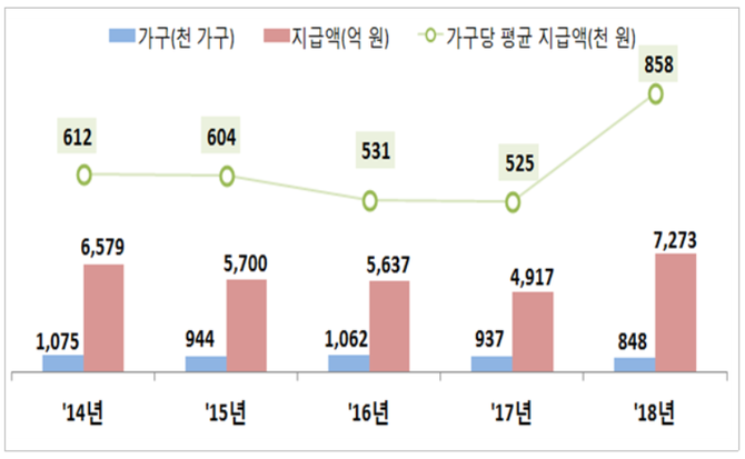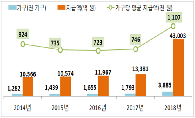 가구당 평균지급액은 110만7000원으로 전년(74만6000원) 대비 48.4% 증가했다.
