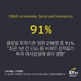 (조세금융신문=고승주 기자) 글로벌 투자기관 핵심 인사 10명 중 9명이 최근 1년간 환경·사회·지배구조(ESG) 등 기업의 비재무사항이 투자 의사결정에 중대한 영향을 주었다고 판단했다. 회계·컨설팅 법인 EY한영이 공개한 ‘EY 기후변화와 지속가능성 서비스(Climate Change and Sustainability Services, 이하 CCaSS) 5차 설문조사’에 따르면 글로벌 기관 투자자들이 기업의 실적과 투자가치 평가 시 환경(Environmental), 사회(Social), 지배구조(Governance) 지표의 비중이 갈수록 확대되는 것으로 보고됐다. 설문조사에 참여한 기관 투자자 중 91%는 지난 12개월 동안 기업의 비재무 성과가 투자 의사결정의 주요 고려사항으로 작용했다고 답했다. 비재무실적이 영향을 미친 경우가 빈번했다고 답한 응답자 비율의 경우 43%로 지난 2018년 4차 조사(34%) 대비 9%포인트 올랐다. 응답자 98%는 기업 공시를 기반으로 비재무 실적을 평가하는 것으로 나타났다. 72%는 ESG 등 기업의 비재무 분야 평가를 위해 체계적인 분석 방법론을 활용한다고 밝혔다. 이는 2018년 3차 조사(32%) 당시 응답률을 두