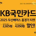 (조세금융신문=김영기 기자) KB국민카드(사장 김재관)가 2025년 KBO 정규시즌을 맞아 프로야구 팬들을 위한 두산 베어스 홈경기 입장권 할인을 진행한다고 27일 밝혔다. 서울 잠실야구장에서 열리는 두산 베어스 홈경기 레드석, 외야석 입장권을 KB국민카드(기업, 비씨, 선불카드 제외)로 현장 또는 온라인 결제할 경우 1인 1매에 한해 2025원 할인 혜택을 제공한다. 해당 할인은 정규시즌 기간 동안 카드 이용실적과 관계없이 경기당 1회 적용 가능하다. 4월부터 8월까지 매월 1회 ‘KB Pay 데이’를 운영하며, 기존 홈경기 2025원 할인과 더불어 추가 입장권 1매에 대해 2025원 할인을 제공한다. 추가 할인 혜택은 경기당 2025명에게 제공되며 자세한 사항은 KB Pay 앱에서 확인 가능하다. KB국민카드 관계자는 “이번 행사는 야구 팬들에게 실질적인 혜택을 제공하는 기회가 될 것”이라며, “앞으로도 고객의 라이프 스타일에 밀접한 맞춤형 마케팅을 지속해 나갈 계획”이라고 말했다. 한편 KB금융(회장 양종희)은 국민과 함께 성장하고자 하는 핵심가치를 바탕으로 육상, 수영 등 스포츠 기초종목과 쇼트트랙, 피겨 등 다양한 종목의 유망주를 발굴하고 국가대표와