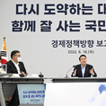 (조세금융신문=고승주 기자) 윤석열 대통령이 16일 오전 경기도 성남시 판교 제2테크노밸리 기업성장센터에서 새정부 경제정책방향 발표 회의를 열었다. 민간에선 최태원 대한상공회의소 회장, 김기문 중기중앙회장, 손경식 경영자총협회장, 양용현 KDI 규제연구센터장, 이채린 서울대 반도체공동연구소장, 조상현 글로벌 공급망 분석센터장, 김승배 한국부동산개발협회 회장, 원영희 소비자단체 협의회장 등이 참석했다. 국민의힘에서는 성일종 정책위의장이 자리했다. 정부 측에서는 한덕수 국무총리, 추경호 경제부총리, 박보균 문체부‧정황근 농림부‧이창양 산업부‧한화진 환경부‧이정식 고용부‧김현숙 여가부‧원희룡 국토부‧조승환 해수부‧이영 중기부장관, 방문규 국무조정실장, 방기선 기재부 1차관, 장상윤 교육부 차관‧한창섭 행안부 차관, 조규홍 복지부 1차관, 김소영 금융위‧윤수현 공정위 부위원장 등 각 부처 주요 관계자들이 참여했다. 대통령실에서는 이진복 정무수석, 최상목 경제수석, 안상훈 사회수석, 박성훈 기획비서관, 김병환 경제금융비서관, 강인선 대변인 등이 자리했다. [조세금융신문(tfmedia.co.kr), 무단전재 및 재배포 금지]