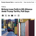 (조세금융신문=최주현 기자) 도널드 트럼프 미국 대통령의 관세정책 이래 미국을 런던과 유럽의 동맹국으로 생각하는 영국 시민의 비율이 역대 최저치로 떨어졌다. 영국인들은 심지어 미국을 ‘전반적으로 비우호적인 국가’로 생각하는 비율이 종전 9%에서 최근 17%로 증가했고, ‘유럽에 위협이 되는 나라’로 여기는 사람의 비율도 종전 3%에서 9%로 증가한 것으로 나타났다. 미국 매체 <블룸버그>는 24일(런던 현지시간) “영국의 인터넷 기반 시장 조사 및 데이터 분석 기업인 유고브 (YouGov)의 여론조사 결과, 지난 12월 ’미국을 런던과 유럽의 동맹국으로 생각한다’는 영국인이 42%였는데, 24일 발표된 조사에서는 기록이 시작된 2019년 이래 최저치인 30%로 떨어졌다”면서 이 같이 보도했다. 유고브에 따르면, 영국과 미국이 긴밀한 관계를 유지하고 있다고 생각하는 영국 시민의 비율은 작년 12월 41%에서 이번에 35%로 감소했다. 더욱이 같은 기간 “미국과의 관계가 약화되기를 원한다”고 응답한 영국 사람들의 비율은 13%에서 21%로 증가했다. 설문 참여자의 42%는 “영국이 유럽과 더 긴밀한 관계를 추구해야 한다”고 답했다. 유고브의 이번 설문