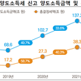(조세금융신문=고승주 기자) 지난해 신고한 양도소득이 부동산 경기가 급등한 2020년보다 소폭 햐항한 것으로 나타났다. 그럼에도 부동산 경기 급등 이전인 2019년보다 22조원 넘게 많았다. 국세청이 20일 공개한 4분기 국세통계에 따르면, 2022년 귀속 양도소득세 예정‧확정 신고 건수는 66.4만건이었다. 전체 양도자산 건수는 107.8만건으로 토지(56.1만건, 52%), 건물(24만건, 22.3%), 주식(23.1만건, 21.4%) 순으로 많았다. 전체 양도소득금액은 90.9조원으로 2020년(102.7조원), 2021년(137.2조원)보다는 낮았지만, 부동산 경기 급등 전인 2019년(68.6조원)보다 22.3조원 늘었다. 2022년 양도소득 총결정세액은 25.6조원으로 소득 대비 실효세율은 28.2%이었다. 5년 전보다 신고 건수는 12.5%(9.5만건) 감소했지만, 양도소득금액은 23.2%(17.1조원), 총결정세액은 43.8%(7.8조원) 많았다. 신고 한 건당 평균 양도소득금액은 1억3690만원으로 5년 전(9723만원)보다 3967만원(40.8%) 늘었다. [조세금융신문(tfmedia.co.kr), 무단전재 및 재배포 금지]