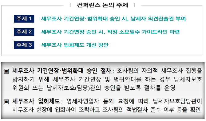 1주제로 세무조사 기간연장‧범위확대 승인 시 납세자 의견진술권 부여, 2주제로 세무조사 승인 시 적정 소요일수 가이드 라인 마련 등이 논의됐다.