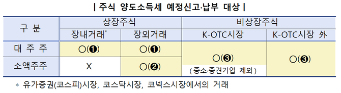 신고대상은 ▲상장주식을 양도한 대주주 ▲상장주식을 장외거래한 소액주주 ▲비상장주식을 양도한 주주가 신고대상이다(중소·중견기업 주식을 K-OTC 시장에서 거래한 일부 주주는 제외).