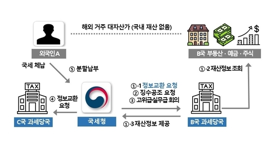 국세청은 A가 거주는 B국 국세청에 A의 재산 현황을 조사해 달라는 정보교환을 요청, 부동산·주식·계좌 등 수백억 원의 해외재산 내역을 확인하고, B국 국세청에 징수공조를 요청했다.