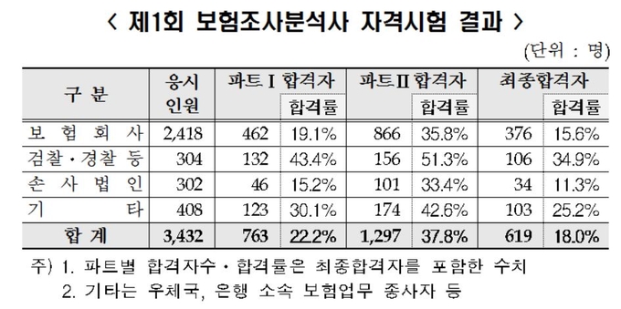 이번 시험에는 주요 생·손보사를 비롯한 보험업계 종사자 및 수사업무 관계자 등 총 3432명이 응시해 619명이 최종 합격해 18.04%의 합격률을 기록했다.