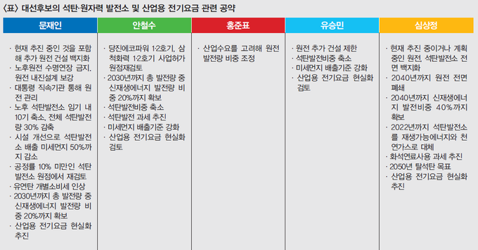 기본적으로 문, 안, 유, 심 후보 모두 산업용 전기요금을 손보겠다는 의사를 밝히긴 했지만, 안 후보와 유 후보는 검토 단계에 불과하며, 문 후보와 심 후보가 산업용 전기요금을 조정하겠다며 적극적 의사를 밝혔다.