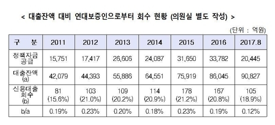 지난 2011년 연대보증인으로부터 회수되는 것으로 추정되는 금액은 전체 회수금액 518억원의 15.6%인 81억원이었으나 이듬해인 2012년 103억원(21.0%)으로 늘어난 이후 2013년 109억원(20.2%), 2014년 114억원(20.9%), 2015년 178억원(21.2%), 2016년 167억원(20.8%)으로 매년 비슷한 수준의 회수율을 보였다.